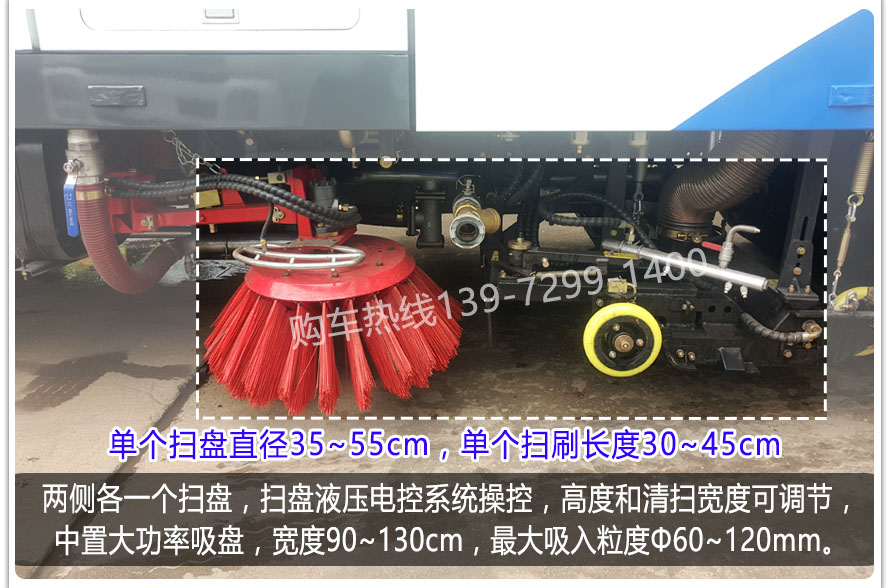 二、上裝配置: 1、帶2個中置掃盤;中置超寬吸嘴;雙層吸塵筒;康明斯170馬力副發(fā)動機,3800軸距多利卡配江鈴64kW增壓副發(fā)動機;臺灣液壓閥;大力馬達;德國高壓水泵(前沖/側噴/中噴/后噴霧)/側沖洗水槍/垃圾箱自潔裝置);萬向高壓路沿清洗;威龍低壓泵(前沖),氣動球閥控制;4mm不銹鋼垃圾箱;不銹鋼水箱;德國控制器;尾部箭頭燈;機油、垃圾箱、水箱均帶防溢或低位報警裝置;倒車及洗掃狀態(tài)室內監(jiān)視器;多種語音提示;倒車自動保護、防傾倒垃圾翻車保護、檢修安全保護;20m高壓沖洗卷盤;刷臂轉動機構使用德國進口高新耐磨工程隔套
