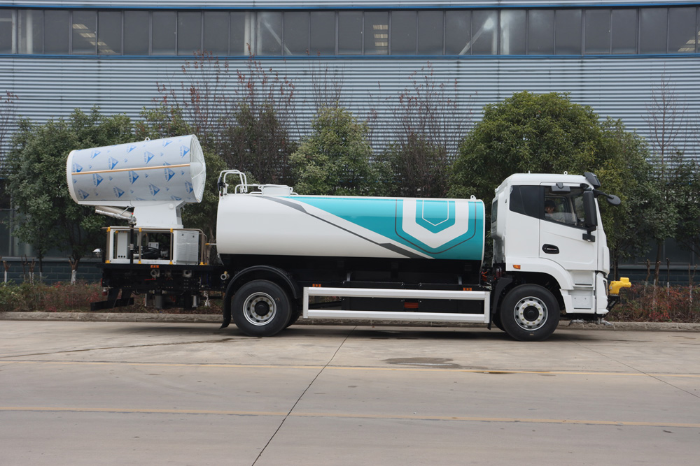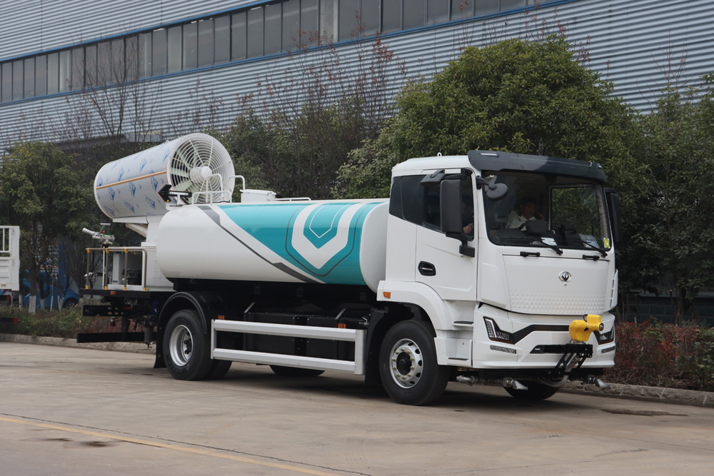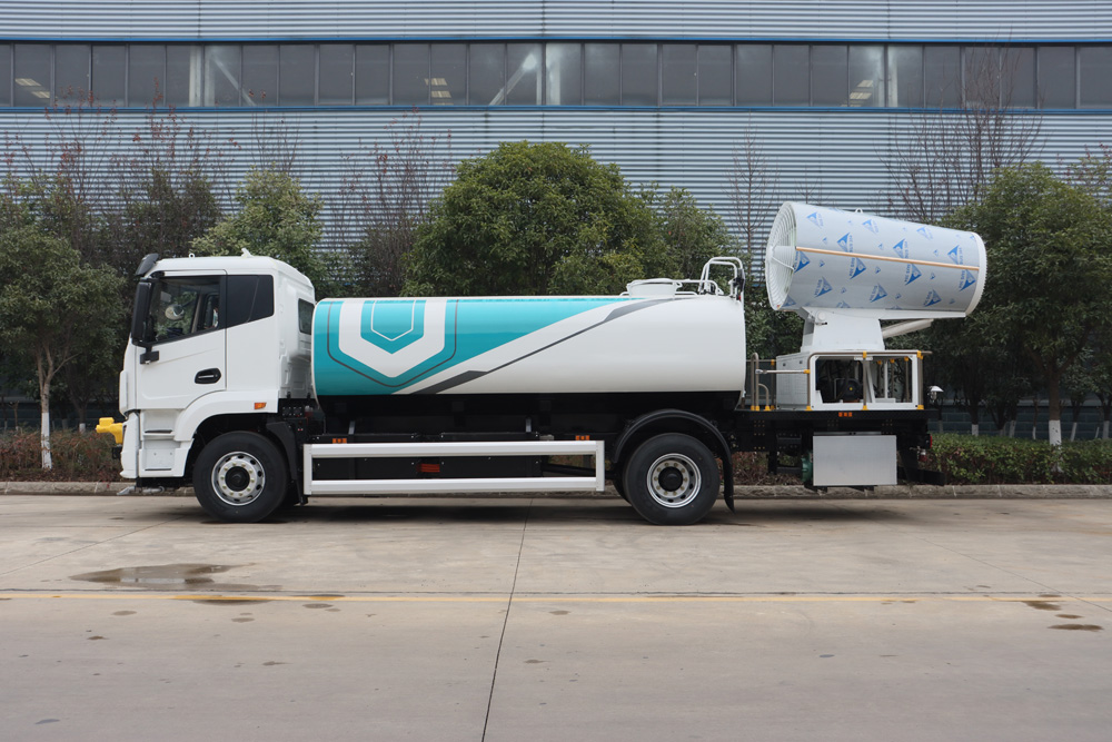 整車具備前噴、對沖、后灑、側噴、綠化水炮、霧炮,外接手動噴槍等多種作業功能,均可單 獨或組合使用,罐體有效容積 9.65m³ , 同級別行業最大;