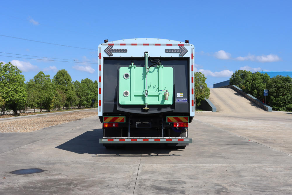 ● 清水箱和垃圾箱分體布置,有效空間利用最大化,一次連續(xù)作業(yè)時(shí)間長。同時(shí)在作業(yè)過程中可通過污水排放裝置對污水進(jìn)行排放,隨時(shí)加清水繼續(xù)作業(yè);垃圾箱采用雙油缸自卸卸料,箱內(nèi)同時(shí)設(shè)有大流量高壓噴嘴,可快速?zèng)_洗垃圾箱